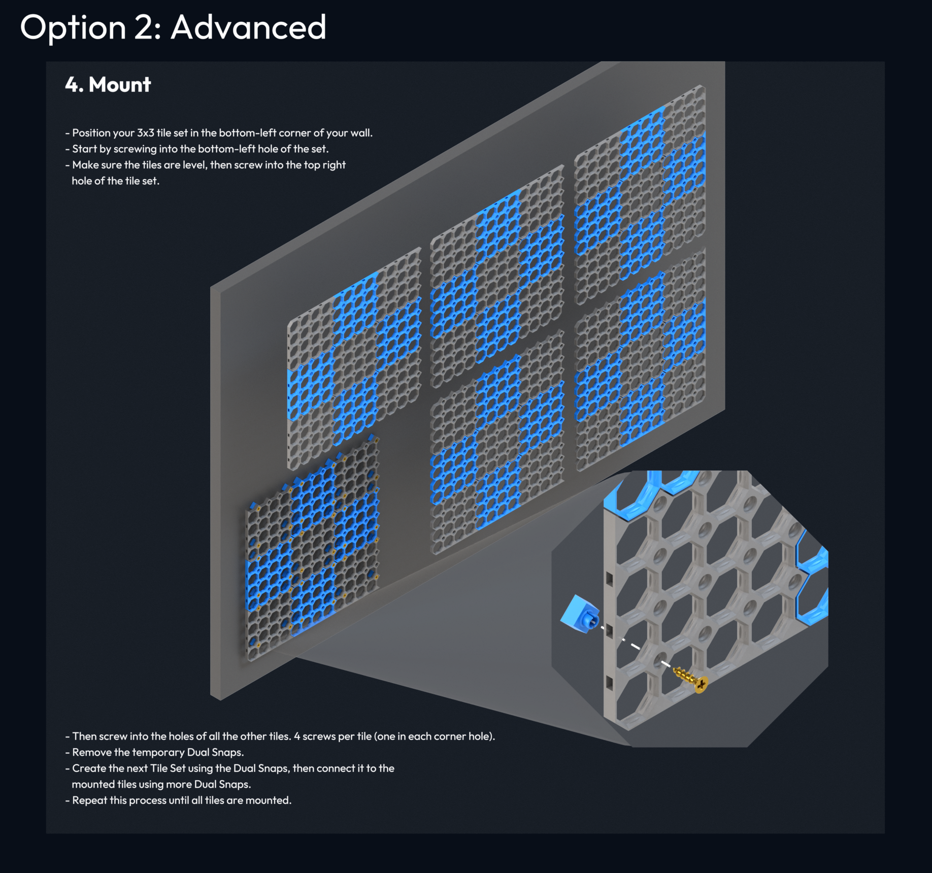 - Instead of mounting tiles one by one, assemble them into 3x3 tile sets first.